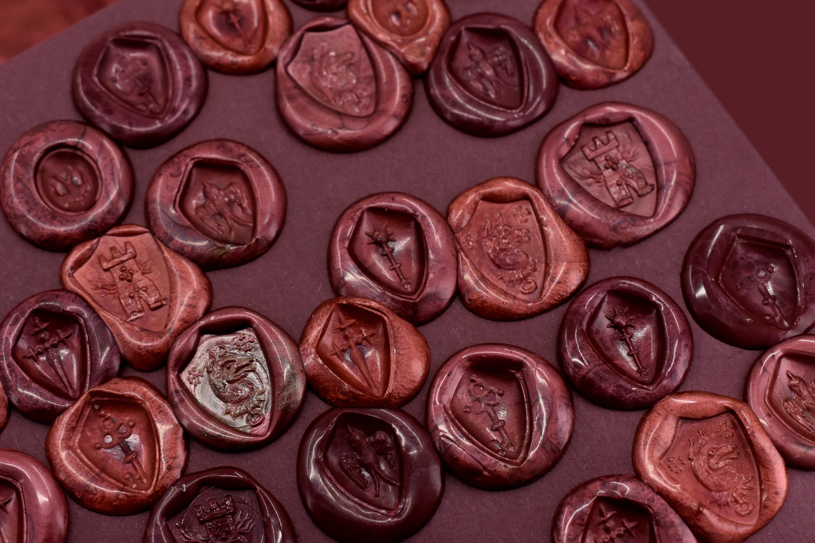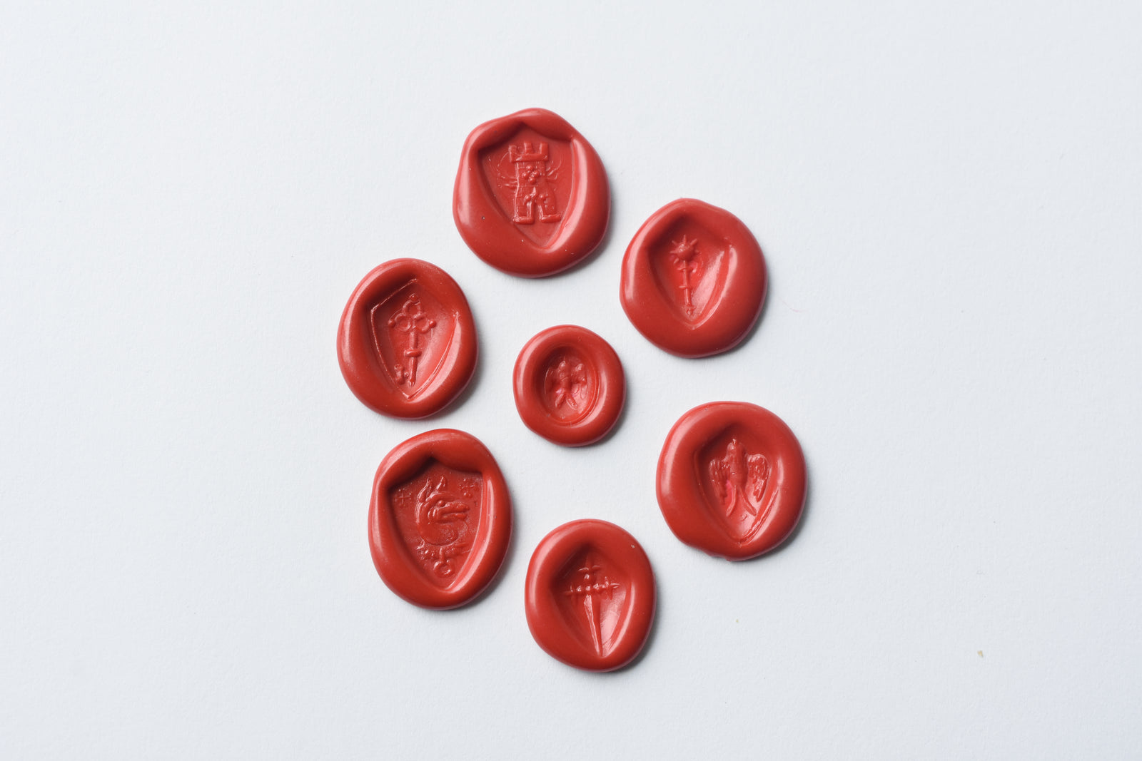 Historically, wax seals functioned as both signature and as a safeguard for protecting important letters. In the medieval period, seals were used to authenticate messages, secure folded documents against tampering, and signal the authority of the sender before the message was even opened. A seal carried the users identity in physical form. Its imagery could represent a household, a role, a personal emblem, or a statement of allegiance. The shield-shaped matrices in this collection are a direct reference to that tradition.