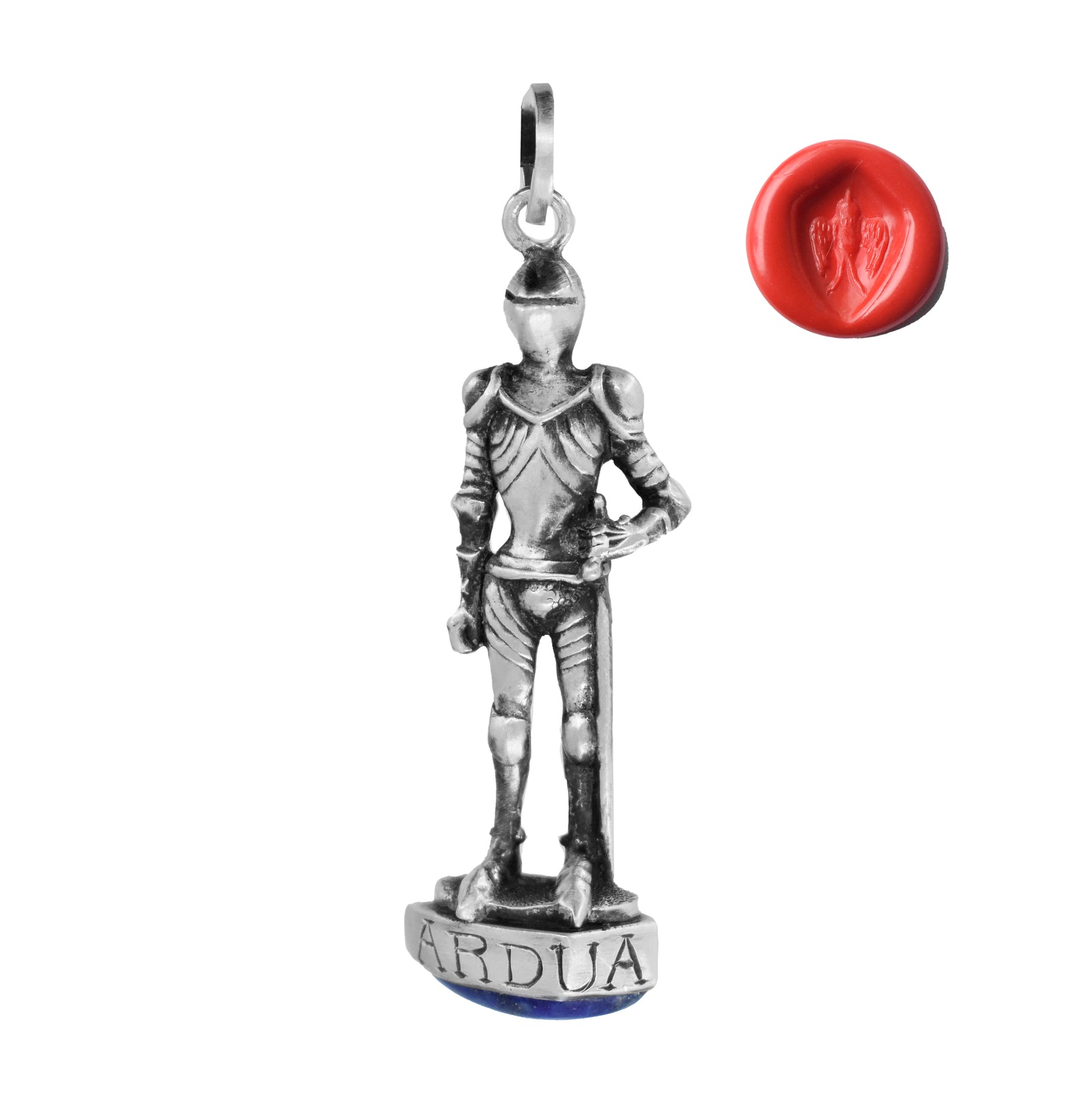 The title plays on the idea of a posted guard, someone stationed in vigilance, and the postal history of wax seals as carriers of identity, authority, and private messages. These pendants celebrate that tradition in a personal way. Each knight can be pressed into wax to leave a mark that is unmistakably your own, as each knight is one-of-a-kind.