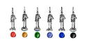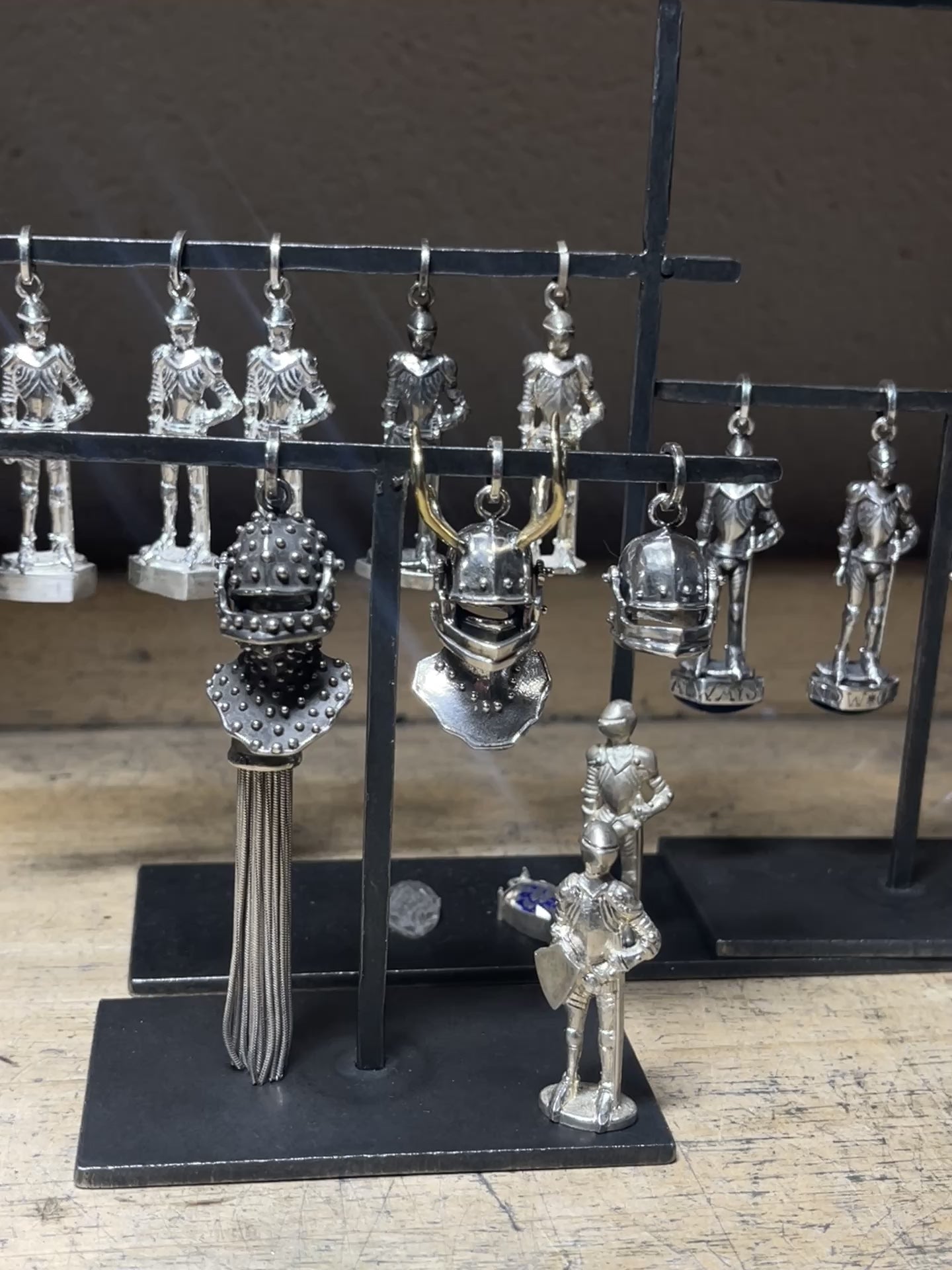 Each piece is built around a miniature armored knight who stands guard both as an ornament and as a tool.