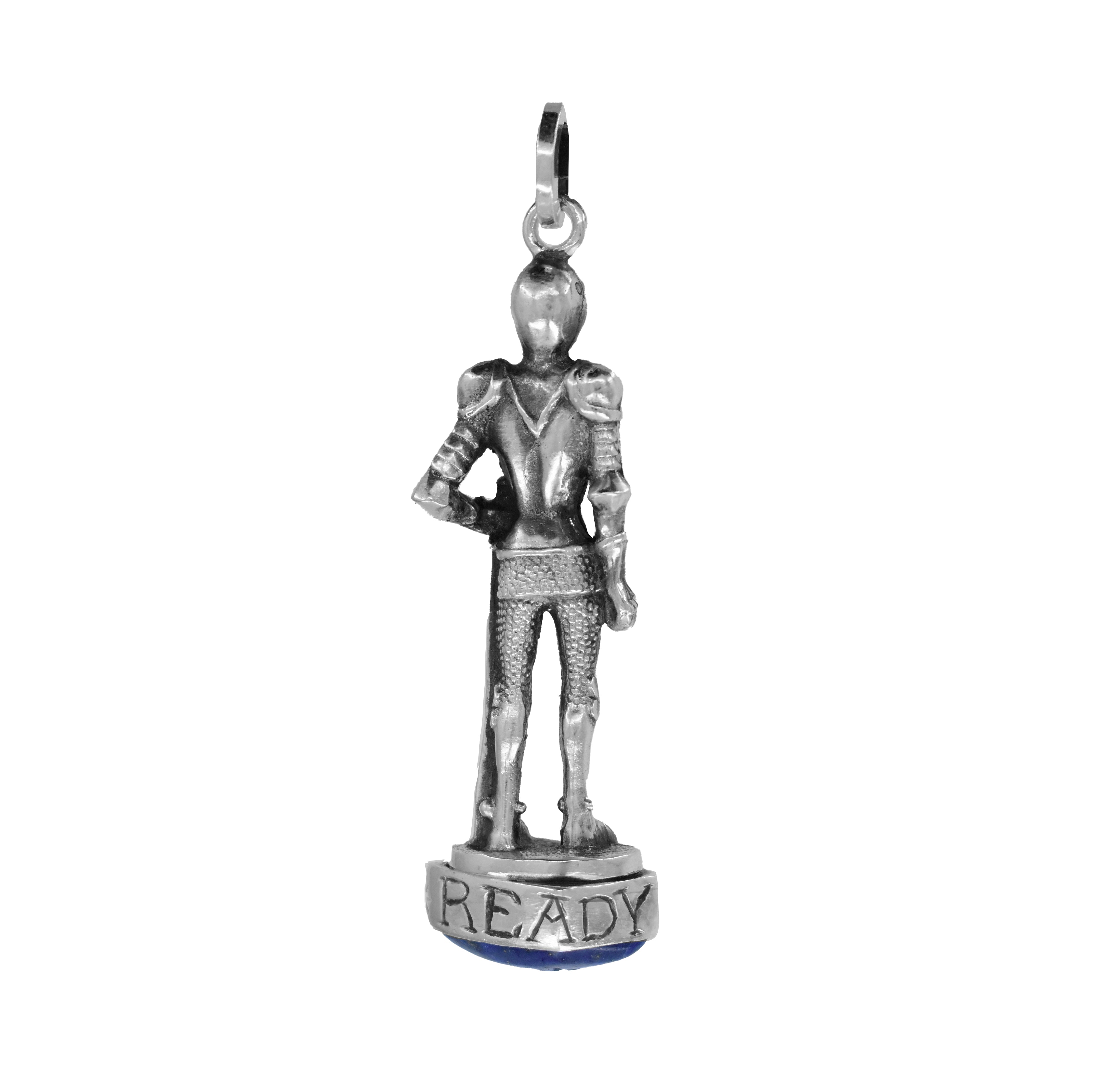 This miniature knight pendant features a lapis lazuli shield matrix with. hand-carved dagger: a symbol historically associated with resolve, protection, and readiness. Arounf the base the phrase ALWAYS READY has been hand engraved.